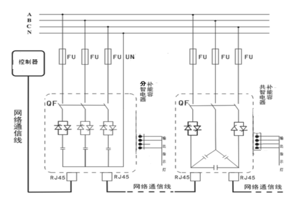 智能組網:485通訊接口,內置 MODBUS-RTU協議;可實現遠程監(jiān)控。產品可多臺聯機使用時,自動產生主機從機,構成無功自動控制系統。