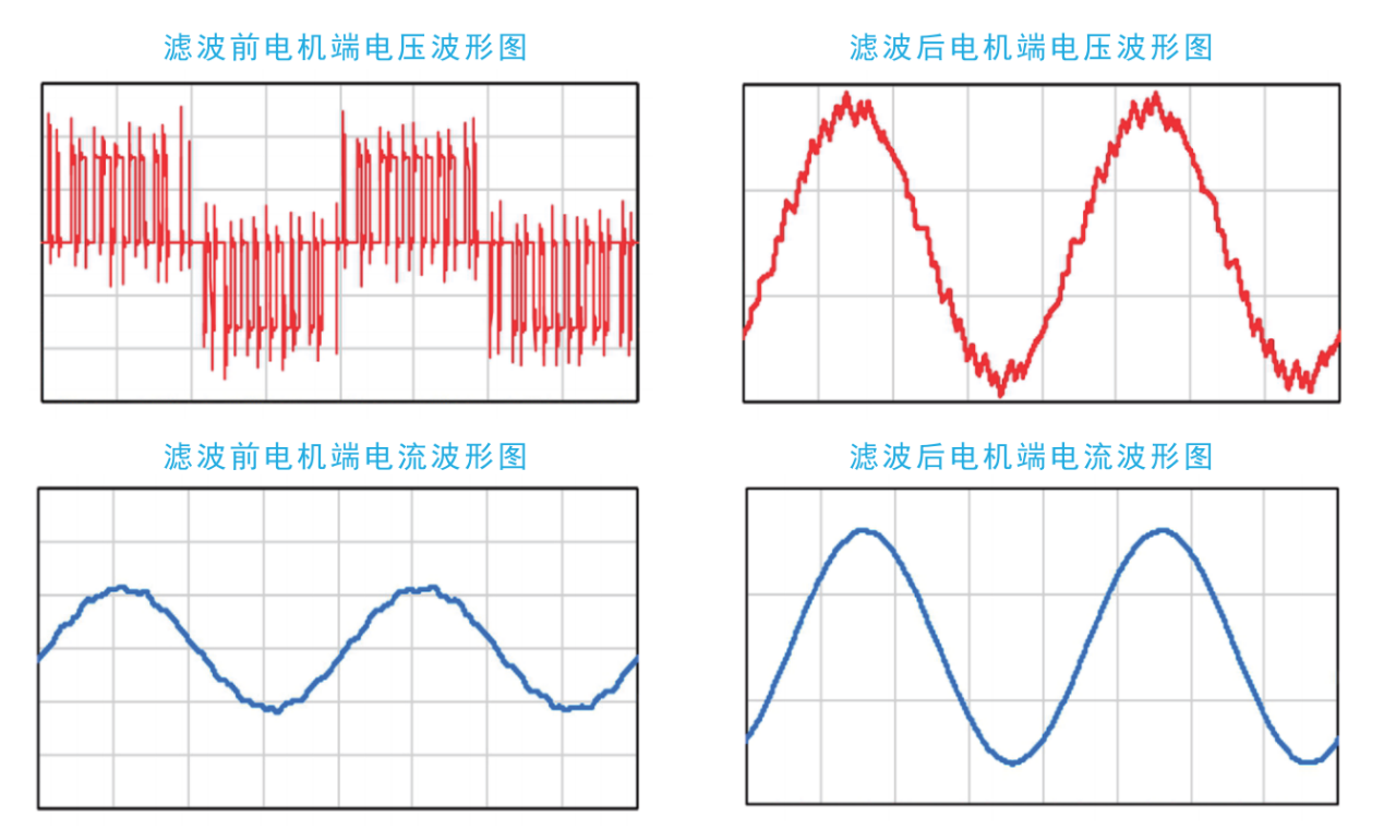 降低變頻器輸出PWM脈沖電壓沖擊,減少電機(jī)端發(fā)生行波反射現(xiàn)象,防止電機(jī)絕緣擊穿,造成電纜爆裂,減少高頻集膚效應(yīng),減少電纜的線損和電機(jī)的銅損,減少高頻渦流效應(yīng),降低電機(jī)鐵芯的鐵損,降低電機(jī)發(fā)熱與絕緣老化,較少對電機(jī)軸承造成損傷。